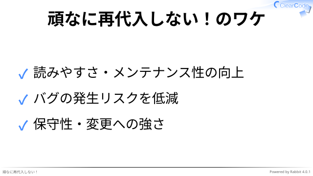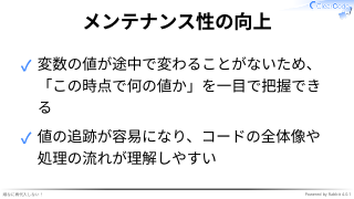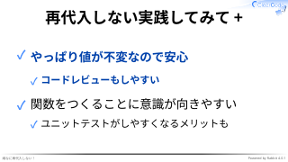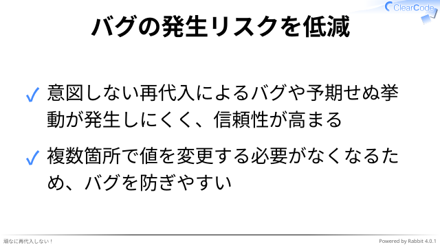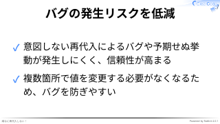 ✓ 意図しない再代入によるバグや予期せぬ挙