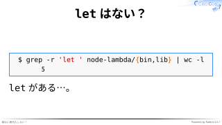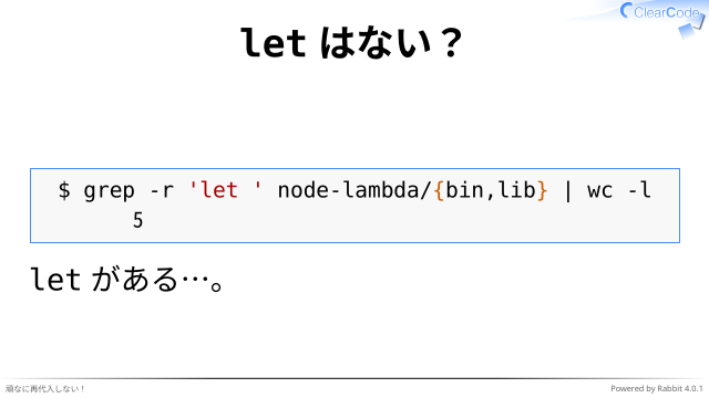 $ grep -r 'let ' node-lambda/{bin,lib} | wc -l