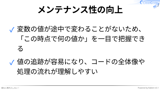 ✓ 変数の値が途中で変わることがないため、