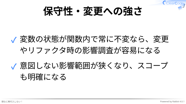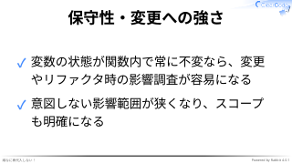 ✓ 変数の状態が関数内で常に不変なら、変更