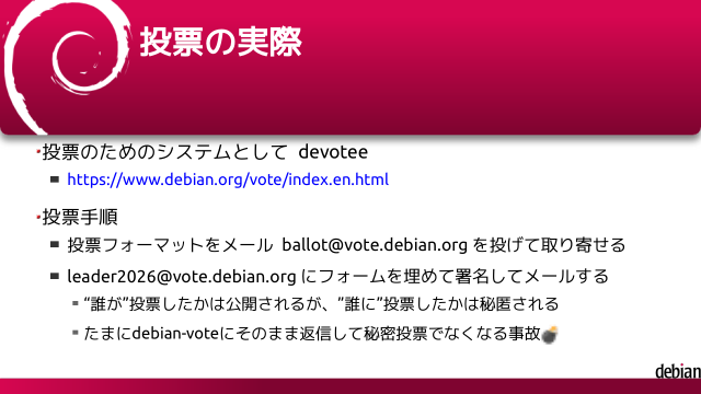 たまにdebian-voteにそのまま返信して秘密投票でなくなる事故