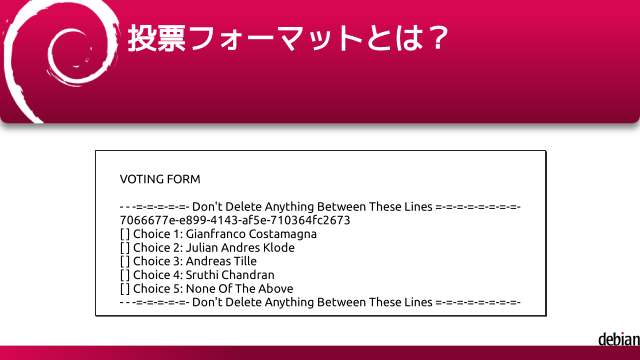 投票フォーマットをメール ballot@vote.debian.org を投げて取り寄せる