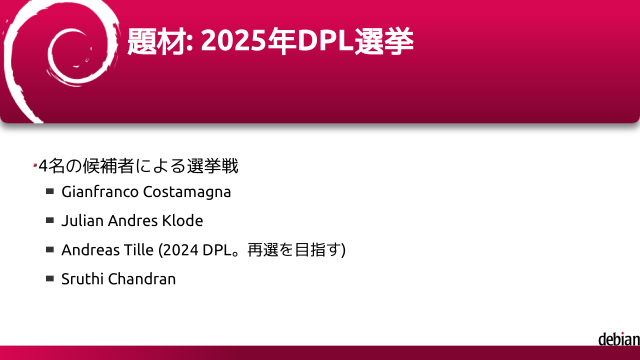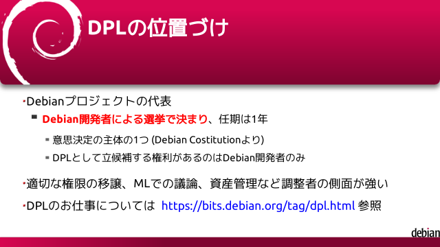 DPLのお仕事については https://bits.debian.org/tag/dpl.html 参照