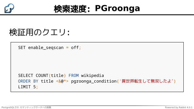 ORDER BY title <&@*> pgroonga_condition('異世界転生して無双したよ')