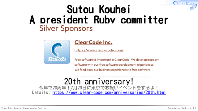 Details: https://www.clear-code.com/anniversaries/20th.html