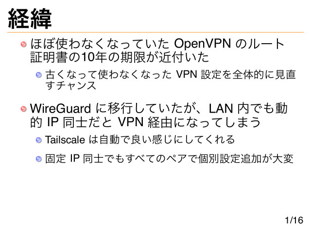 経緯 ほぼ使わなくなっていた OpenVPN のルート 証明書の10年の期限が近付いた 古くなって使わなくなった VPN 設定を全体的に見直 すチャンス WireGuard に移行していたが、LAN 内でも動 的 IP 同士だと VPN 経由になってしまう Tailscale は自動で良い感じにしてくれる 固定 IP 同士でもすべてのペアで個別設定追加が大変 1/16