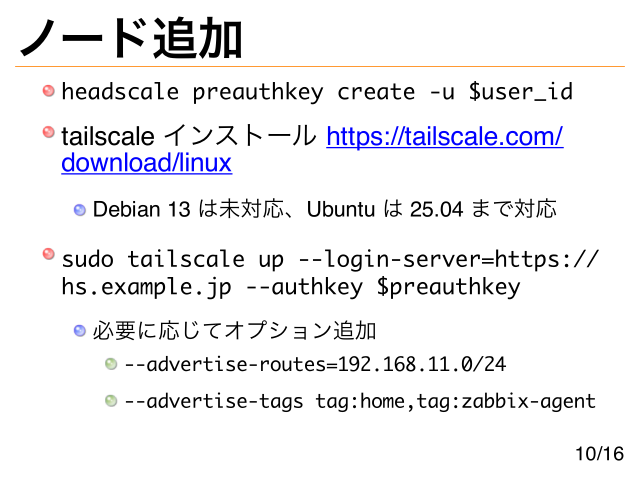 ノード追加 headscale preauthkey create -u $user_id tailscale インストール https://tailscale.com/ download/linux Debian 13 は未対応、Ubuntu は 25.04 まで対応 sudo tailscale up --login-server=https:// hs.example.jp --authkey $preauthkey 必要に応じてオプション追加 --advertise-routes=192.168.11.0/24 --advertise-tags tag:home,tag:zabbix-agent 10/16