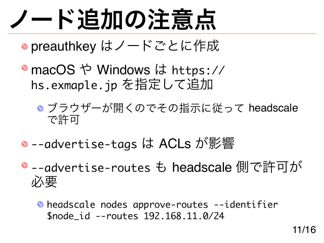 ノード追加の注意点 preauthkey はノードごとに作成 macOS や Windows は https:// hs.exmaple.jp を指定して追加 ブラウザーが開くのでその指示に従って headscale で許可 --advertise-tags は ACLs が影響 --advertise-routes も headscale 側で許可が 必要 headscale nodes approve-routes --identifier $node_id --routes 192.168.11.0/24 11/16