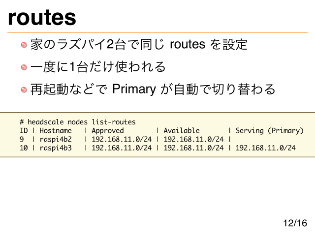 routes 家のラズパイ2台で同じ routes を設定 一度に1台だけ使われる 再起動などで Primary が自動で切り替わる # headscale nodes list-routes ID | Hostname | Approved | Available | Serving (Primary) 9 | raspi4b2 | 192.168.11.0/24 | 192.168.11.0/24 | 10 | raspi4b3 | 192.168.11.0/24 | 192.168.11.0/24 | 192.168.11.0/24 12/16