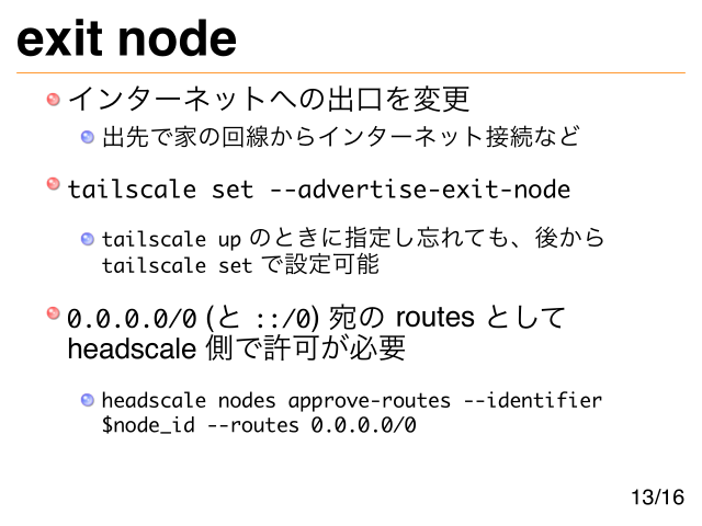 exit node インターネットへの出口を変更 出先で家の回線からインターネット接続など tailscale set --advertise-exit-node tailscale up のときに指定し忘れても、後から tailscale set で設定可能 0.0.0.0/0 (と ::/0) 宛の routes として headscale 側で許可が必要 headscale nodes approve-routes --identifier $node_id --routes 0.0.0.0/0 13/16