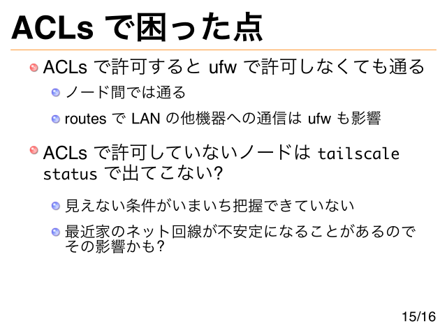 ACLs で困った点 ACLs で許可すると ufw で許可しなくても通る ノード間では通る routes で LAN の他機器への通信は ufw も影響 ACLs で許可していないノードは tailscale status で出てこない? 見えない条件がいまいち把握できていない 最近家のネット回線が不安定になることがあるので その影響かも? 15/16