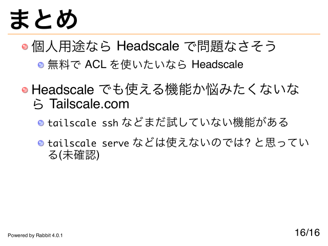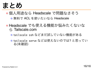 まとめ 個人用途なら Headscale で問題なさそう 無料で ACL を使いたいなら Headscale Headscale でも使える機能か悩みたくないな ら Tailscale.com tailscale ssh などまだ試していない機能がある tailscale serve などは使えないのでは? と思ってい る(未確認) Powered by Rabbit 4.0.1 16/16