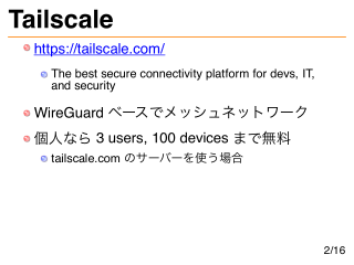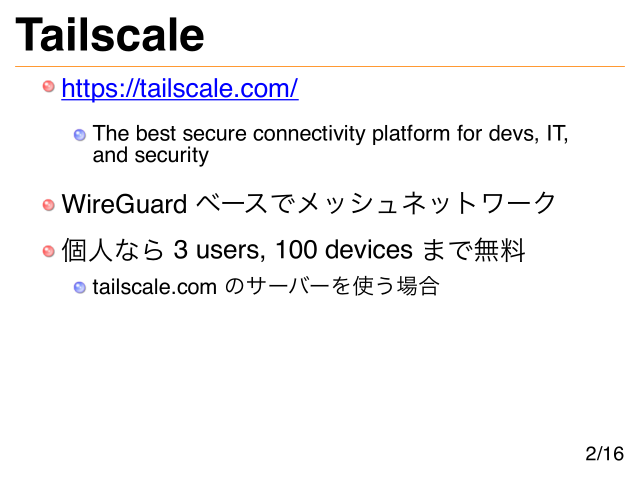Tailscale https://tailscale.com/ The best secure connectivity platform for devs, IT, and security WireGuard ベースでメッシュネットワーク 個人なら 3 users, 100 devices まで無料 tailscale.com のサーバーを使う場合 2/16