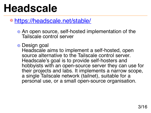 Headscale https://headscale.net/stable/ An open source, self-hosted implementation of the Tailscale control server Design goal Headscale aims to implement a self-hosted, open source alternative to the Tailscale control server. Headscale’s goal is to provide self-hosters and hobbyists with an open-source server they can use for their projects and labs. It implements a narrow scope, a single Tailscale network (tailnet), suitable for a personal use, or a small open-source organisation. 3/16