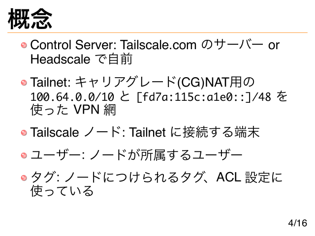 概念 Control Server: Tailscale.com のサーバー or Headscale で自前 Tailnet: キャリアグレード(CG)NAT用の 100.64.0.0/10 と [fd7a:115c:a1e0::]/48 を 使った VPN 網 Tailscale ノード: Tailnet に接続する端末 ユーザー: ノードが所属するユーザー タグ: ノードにつけられるタグ、ACL 設定に 使っている 4/16