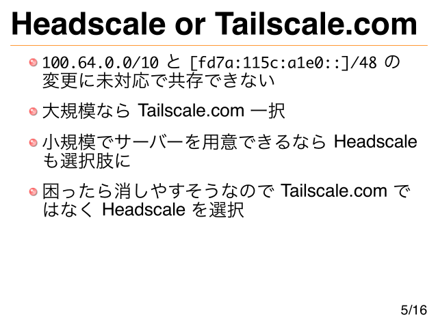 Headscale or Tailscale.com 100.64.0.0/10 と [fd7a:115c:a1e0::]/48 の 変更に未対応で共存できない 大規模なら Tailscale.com 一択 小規模でサーバーを用意できるなら Headscale も選択肢に 困ったら消しやすそうなので Tailscale.com で はなく Headscale を選択 5/16