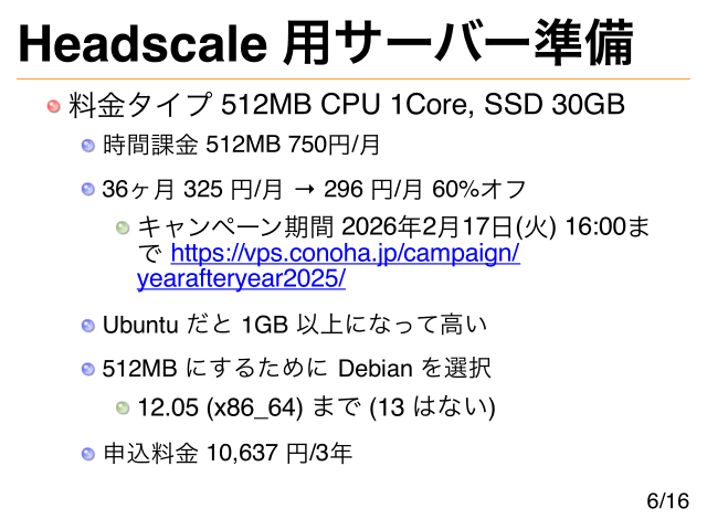 Headscale 用サーバー準備 料金タイプ 512MB CPU 1Core, SSD 30GB 時間課金 512MB 750円/月 36ヶ月 325 円/月 → 296 円/月 60%オフ キャンペーン期間 2026年2月17日(火) 16:00ま で https://vps.conoha.jp/campaign/ yearafteryear2025/ Ubuntu だと 1GB 以上になって高い 512MB にするために Debian を選択 12.05 (x86_64) まで (13 はない) 申込料金 10,637 円/3年 6/16