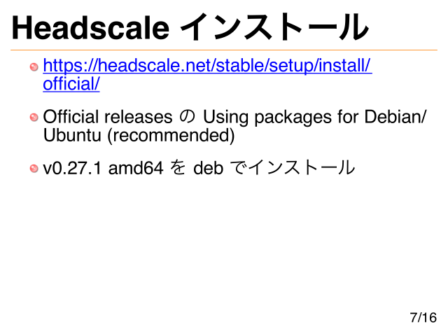 Headscale インストール https://headscale.net/stable/setup/install/ official/ Official releases の Using packages for Debian/ Ubuntu (recommended) v0.27.1 amd64 を deb でインストール 7/16