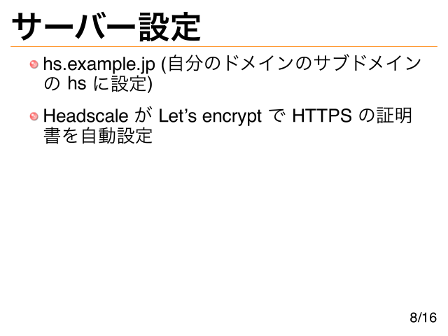 サーバー設定 hs.example.jp (自分のドメインのサブドメイン の hs に設定) Headscale が Let’s encrypt で HTTPS の証明 書を自動設定 8/16