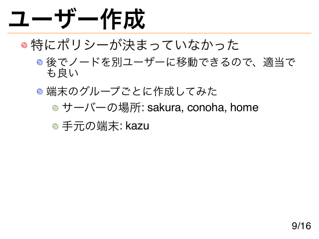 ユーザー作成 特にポリシーが決まっていなかった 後でノードを別ユーザーに移動できるので、適当で も良い 端末のグループごとに作成してみた サーバーの場所: sakura, conoha, home 手元の端末: kazu 9/16
