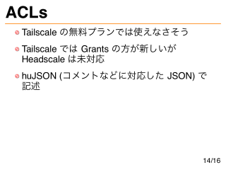 ACLs Tailscale の無料プランでは使えなさそう Tailscale では Grants の方が新しいが Headscale は未対応 huJSON (コメントなどに対応した JSON) で 記述 14/16